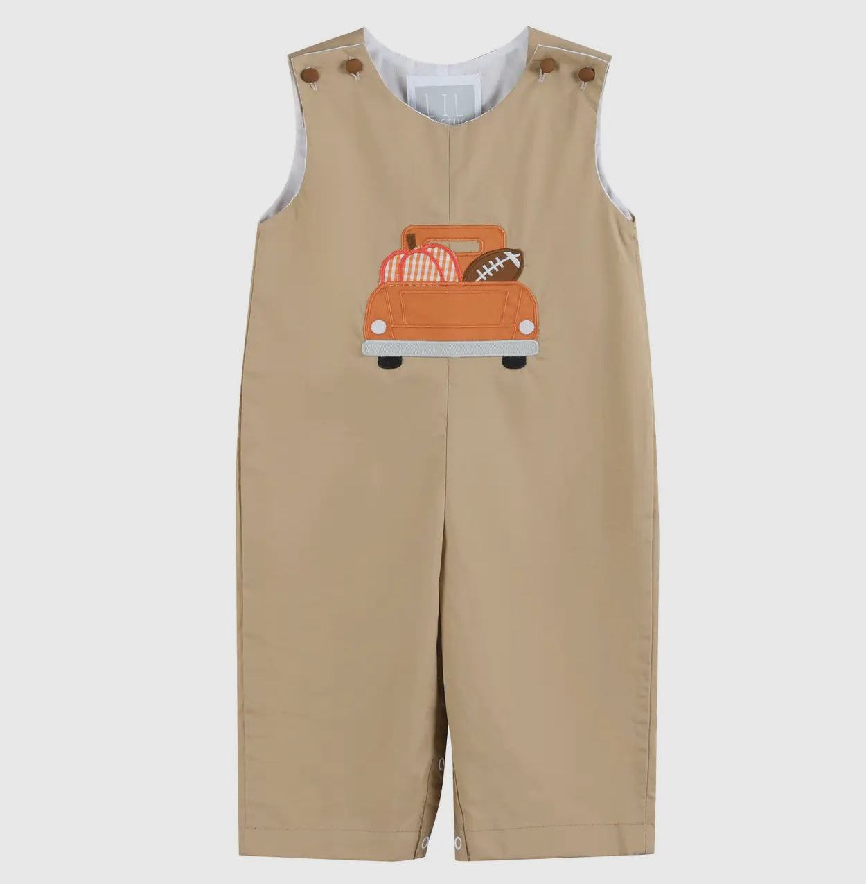 Gear up for fall fun with this adorable tan longall featuring a playful orange truck appliqué loaded with pumpkins and a football! Perfect for hayrides, pumpkin patches, and game days, this classic piece blends charm and comfort. Made from a soft, durable fabric with snap closures for easy changes and buttoned shoulders for a secure fit. This outfit is a must-have for your little one’s autumn adventures!
